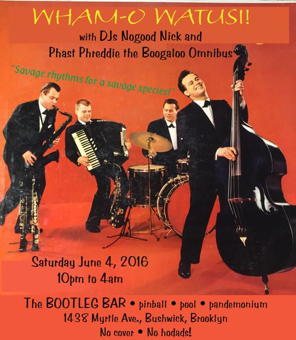 Day Two of the great DJ cultural exchange program took place on Saturday June 4 when Nogood Nick was guest DJ at WHAM-O WATUSI, hosted by Phast Phreddie the Boogaloo Omnibus at the Bootleg Bar in Bushwick, Brooklyn. The WHAM is a little more raucous than Rip! Rig! Panic!, which took place the night before. At the WHAM, the DJs play a lot of jumpin’ R&B, garage rock and rock’n’roll records. On this night, inspired by the presence of Nogood Nick, a fine soul music DJ, an extra helping of stomping soul records were played. Indeed, at one point, Mr. Nick turned to The Boog and declared, “I’m going into my Northern set here…” and he proceeded to play some slammin’ records. Man, you should have been there!!