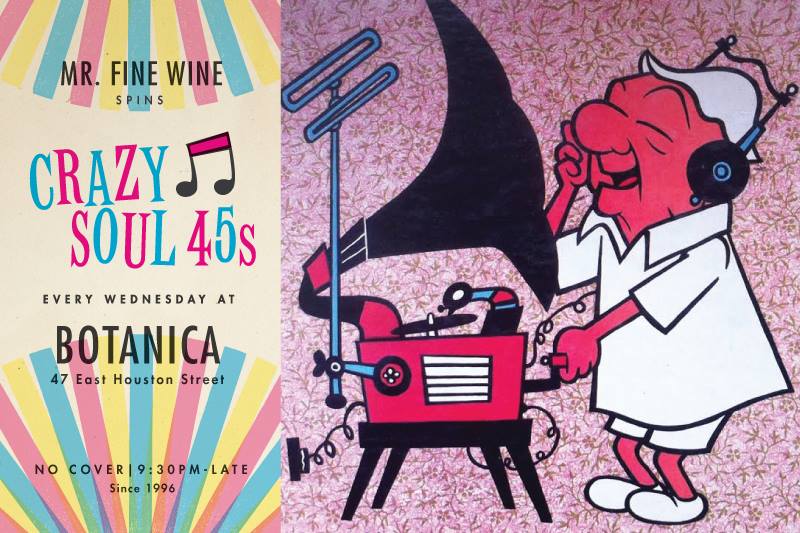 It has been noted several times in the Boogaloo Bag that Mr. Fine Wine also spins records at a cozy Manhattan club called Botanica. Phast Phreddie the Boogaloo Omnibus has DJ’d there with him on several nights, but always special event nights—ie, record release parties, anniversaries, etc. However, on the last night of August, he was asked to be Mr. Fine Wine’s sole special guest at Botanica.