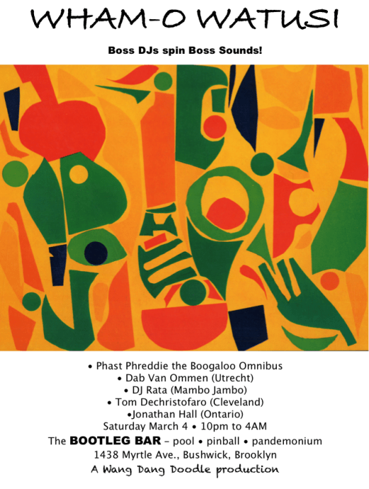 Saturday the Fourth was the date of the March WHAM-O WATUSI; it was both a blessing and a curse. A blessing because our pals Jonathan Toubin and Todd-O-Phonic Todd had scheduled, for Friday the Third, a fabulous program of boss rock and soul acts at the Warsaw: Nick Waterhouse & his band backing Ural Thomas, Baby Washington, Young Jessie, Maxine Brown, Archie Bell and David Johansen; King Khan; Joe Bataan and his Orchestra; all topped off with a very special performance by the legendary Irma Thomas. A most excellent event, and the Boogaloo Bag writers were in attendance and dug the show immensely. This show drew people from all over the world and The WHAM-O WATUSI benefited when several out of town DJs came knocking, looking for jobs for the following night. WHAM-O host and resident DJ Phast Phreddie the Boogaloo Omnibus hired on three of them, plus local selector DJ Rata. It was going to be a very swingin’ affair!!