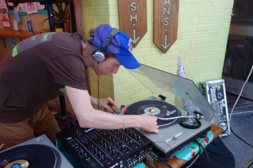 Wig Doctor acts casual as he spins another exciting record at Shake It Up Sunday! Don’t believe the sign; the Wig Doctor did NOT play any trash!!!
