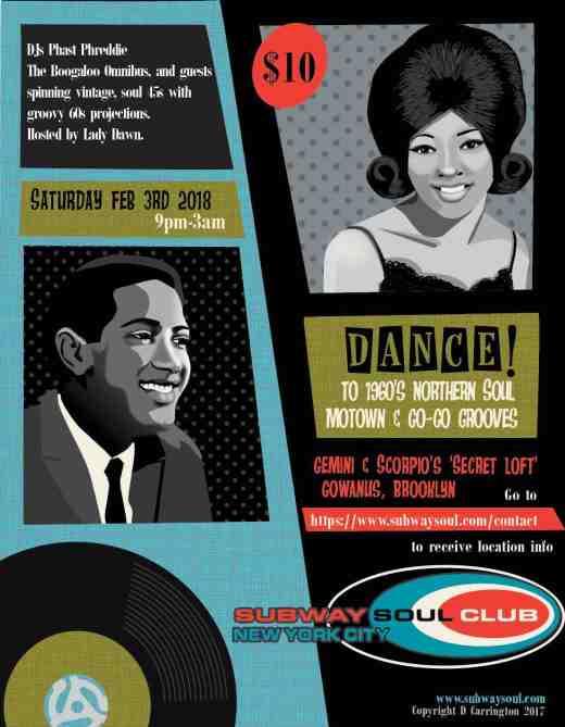 The Subway Soul Club started in December 2001 when Lady Dawn and some of her friends, fellow Brit Jeff Valle and Dr. Scott Bulleit organized the first event, held at a small joint in the Lower East Side of Manhattan. Since then, Lady Dawn would draw up the beautiful flyers, dance around in vintage Mod frocks and take names for her mailing list. Jeff and Dr. Scott, along with a guest DJ or two, played cool records that got folks on the floor dancing. SSC then moved around a little bit, and in the confusion, Jeff and Dr. Scott both moved back to their respective hometowns (Dr. Scott is from San Francisco Bay area) by the summer of 2002. At this point, Phast Phreddie the Boogaloo Omnibus was asked to step in as resident DJ. That July, he helped find a new home–Raffifi on East 11th Street–and it was there that SSC lived so well for so long. When Rififi closed, about four or five years later, the Club became homeless, but carried on nearly every month at several different venues for a few years. The most steady was The Loft in Williamsburg, where SSC held forth until May 2011, when Lady Dawn decided to give it a rest.