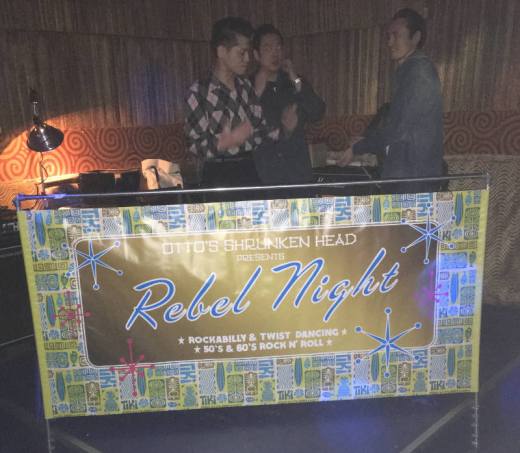 When 10 O’clock rolled around, it was time to stop the Rip! Rig! Panic! event and time to start Rebel Night, which was scheduled to take place from 10 to 4 in the back room. Just like that, Otto swung its Shrunken Head from Mod Jazz to rip roaring rockabilly. Rebel Night has returned to its ancestral home at Otto’s. It was held at the East Village tiki-themed rock club for several years, before it moved to a couple of other locations. Now it is back where it belongs–in Otto’s back room where there is room to dance and the records can be turned up loud. The place was packed and the Rebel Night DJs had a brand new banner they were proudly displaying.