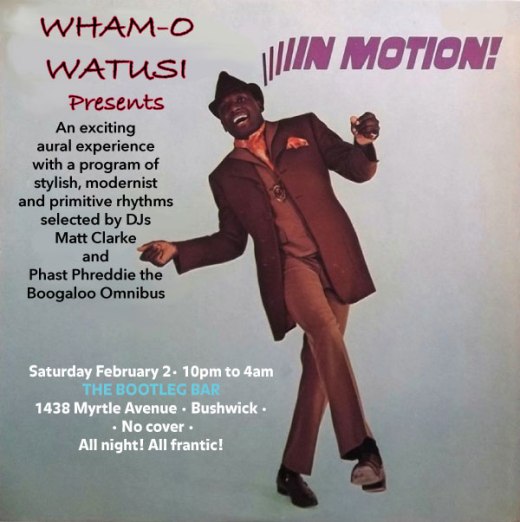 With less than five days notice, Phast Phreddie the Boogaloo Omnibus was required for DJ service on Saturday February 2. A guest DJ would be needed, but who could swing on such short notice? Probably only someone who lives in the area. The first person anyone thinks of when thinking about Bushwick is Mr. Vacation, of course, but he was guest DJ in December. How about Brandon Peck AKA Handsome Vanzant. He’s off vacationing with his lovely wife on some remote Mexican island! Anyway, we’d like to give him more time because he always draws fabulous posters for the events. Then there’s Matt Clarke—The Elevator Operator. He lives nearby, has great records and is one cool cat. Lucky for us he was available and did a noteworthy job at the WHAM-O WATUSI.