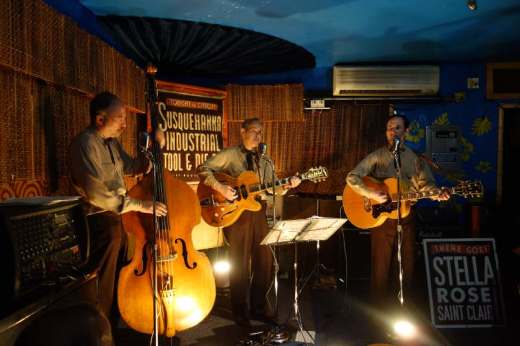 A special added attraction to this evening was the presence of the great western swingabilly group Susquehanna Industrial Tool and Die Company. SIT & Die, as its many fans like to call the band, is known for its unique take on boogies, ballads and blues. The trio played in the back room, while the Bangarang took place in the front, submitting those in attendance to a sort of cultural whiplash. The SIT & Dies have a residency at Otto’s on the fourth Thursday of the month. But for some reason, the April gig was moved to the third Thursday. Good thing, because this is one of The Boogaloo Omnibus’ favorite bands and he rarely gets a chance to go see it any more. On this night, he was able to witness several sets, plus play some totally unrelated records in the front room. Also on this night, the jumpin’ little trio was aided and abetted by the thrush Stella Rose Saint Clair, whose lovely voice treated all to wonderful renditions of popular ballads.