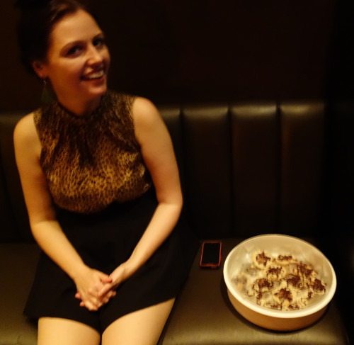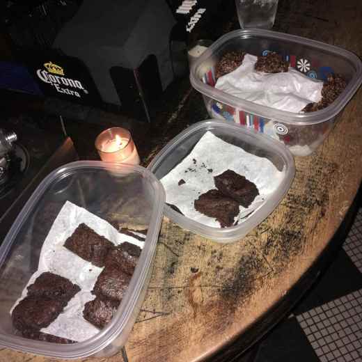 Adding to the festivities were the delicious no-cook, oatmeal-peanutbutter-chocolate cookies and spicy vegan brownies made by Miss Nancy Gardner–who, alas, was absent from the scene. But several of our friends were on hand to eat them, and at the end of the night, Mr. Vacation took a big container of the leftovers home!