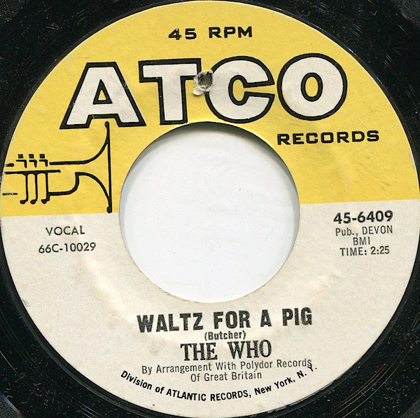 “Waltz for a Pig” was released as a B-side to The Who’s 1966 “Substitute” single and credited as “The Who Orchestra” on some releases, or “The Who” on others. Apparently, due to legal action regarding the producer Shel Talmy, “Substitute” was issued several times, first with “Circles” (also called “Instant Party”) as the B-side. The Who’s then-manager Robert Stigwood decided to clear up the mess by placing a different track on the B-side, “Waltz for a Pig” (which was actually by another band he managed, The Graham Bond Organization). According to rumor, the “pig” in the title is supposed to be a dig at Talmy, who produced some fabulous early records by The Who. “Waltz” was said to have been written by Organization drummer Ginger Baker using the pseudonym, Harry Butcher. Also—probably due to the Stigwood connection—this is was issued in America on Atco. Stigwood had a connection at Atco, as other bands he managed—Bee Gees, Cream—also issued their records on Atco in the U.S.