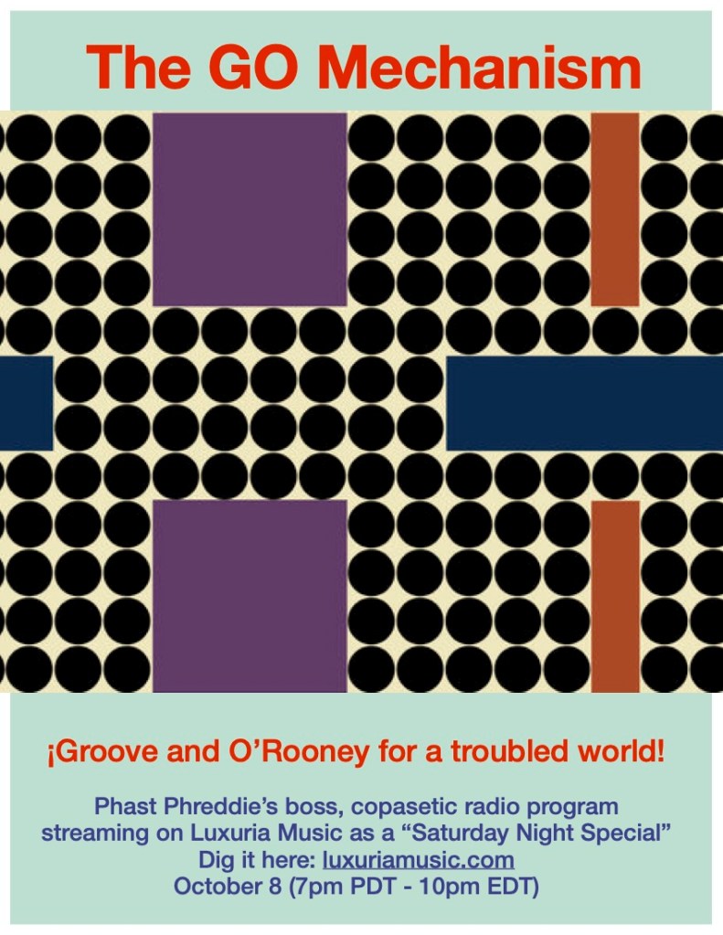 Welcome to the notes for The GO Mechanism Number Eleven. The GO Mechanism is an audio odyssey of boss beats and reet rhythms that endeavors to compel the listener to tap one’s foot as the mind expands. The program is hosted by Phast Phreddie the Boogaloo Omnibus, a fellow who has been around several musical scenes. The “G” is for Groove, and in order to keep the Groove grooving, we don’t stop to smell the roses or back announce records. A complete track listing is found here in the Boogaloo Bag. The “O” is for O’Rooney—an intangible, supernatural power that puts the ‘oo’ into cool. O’Rooney is spread on thick in each GO Mechanism—listen and you will learn. The GO Mechanism originates on the Luxuria Music website as part of its Saturday Night Special series. This one will have its first run on Saturday October 8 at 10PM East Coast Time.