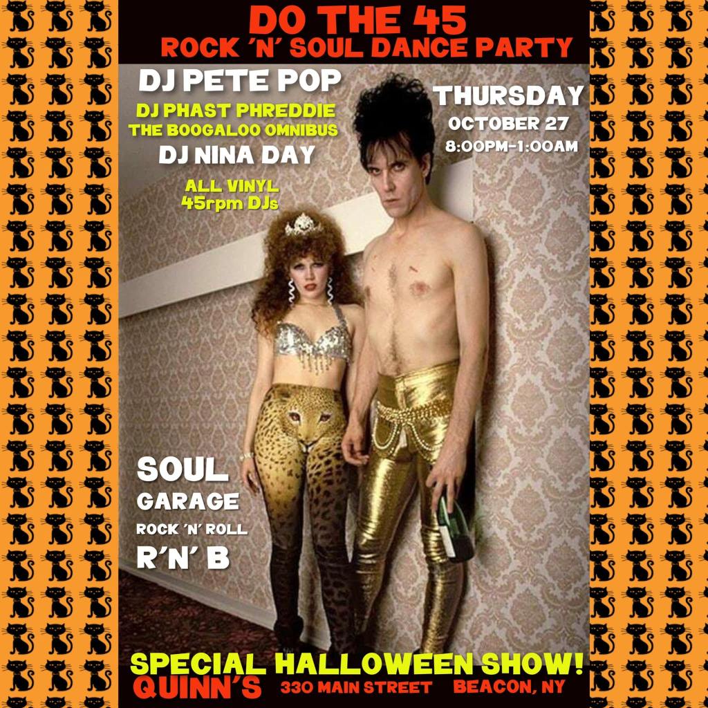 Do The 45 is the reet music record hop hosted by DJ Pete Pop and held on the last Friday of the month at Quinn’s in Beacon, NY. Mr. Pop picked his guest disc slingers: Nina Day (aka Hardly Quinn) and Phast Phreddie the Boogaloo Omnibus. With the date’s close proximity to Halloween, folks were asked to dress in costume and a swingin’ night was guaranteed to take place.
