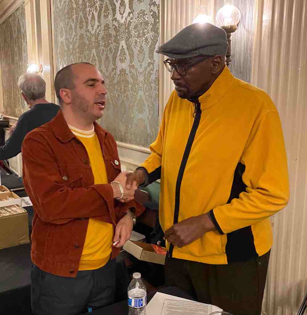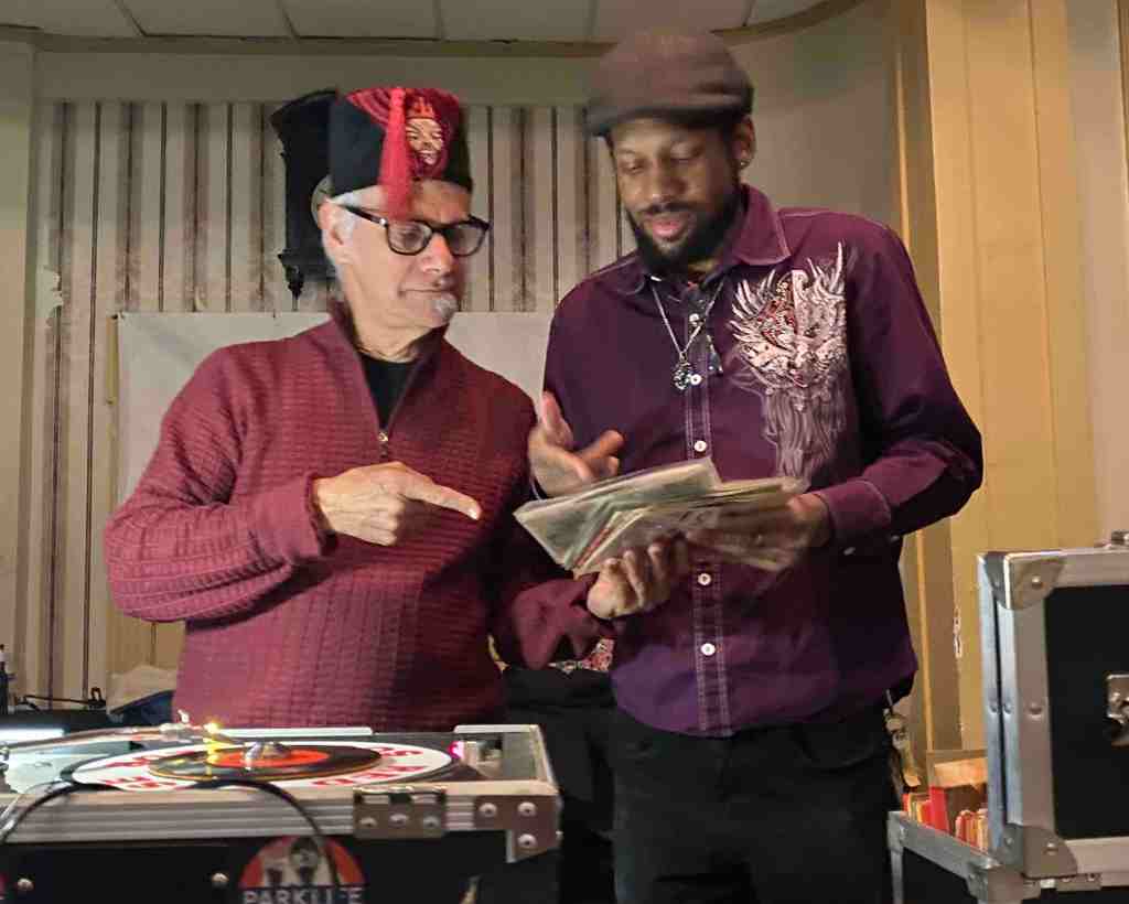 Meanwhile, as all the dancing was going on in the main room of the Elks Lodge, in the chill-out room where the bar was, folks were selling records. Phast Phreddie the Boogaloo Omnibus was able to enhance his record collection considerably—plus he sold and traded several records from his own collection. Also in the chill-out room on Saturday afternoon Chet Stewart of local soul legends The Trenells signed autographs and sold a limited edition reissue of one of his records. At one point, he came on stage as his record was played.