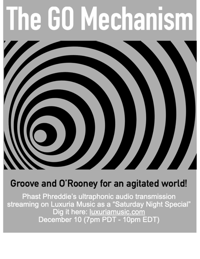 The GO Mechanism is an audio odyssey of boss beats and reet rhythms that endeavors to compel the listener to tap one’s foot as the mind expands. The program is hosted by Phast Phreddie the Boogaloo Omnibus, a fellow who has been around several musical scenes. The GO Mechanism originates on the Luxuria Music website as part of its “Saturday Night Special” series. This one will have its first run on Saturday December 10 at 10PM East Coast Time. If you are listening to The GO as it initially airs over the Luxuria Music web streaming hustle, please join us in the Lux Mu chat room for more fun. Otherwise, check the Luxuria Music podcasts—this one will be listed as a “Saturday Night Special” dated 12/11/2022. The Lux Mu podcast will be available for a couple of weeks, then it goes to the mixclouds and the bottom of this post. The “G” is for Groove, and in order to keep the Groove grooving, we don’t stop to smell the roses or back announce records. A complete track listing is found below. The “O” is for O’Rooney—an intangible, supernatural power that puts the ‘oo’ into cool. O’Rooney is spread on thick in each GO Mechanism—listen and you will learn.