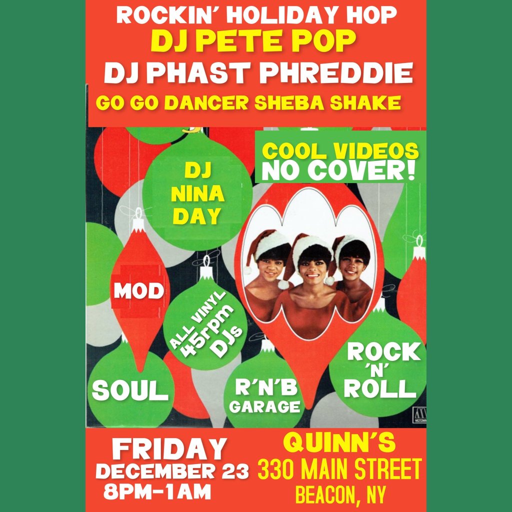 On Wednesday, December 21, Phast Phreddie The Boogaloo Omniubus got an urgent call from DJ Pete Pop. The management at Quinn’s—the groovy rock and ramen joint in Beacon where Pete hosts his Do The 45 shindigs once a month—called him and asked him to assemble the troops for a bash THAT Friday night (December 23, night before Christmas Eve). Can The Boog swing? His reply: Yes, indeed!
