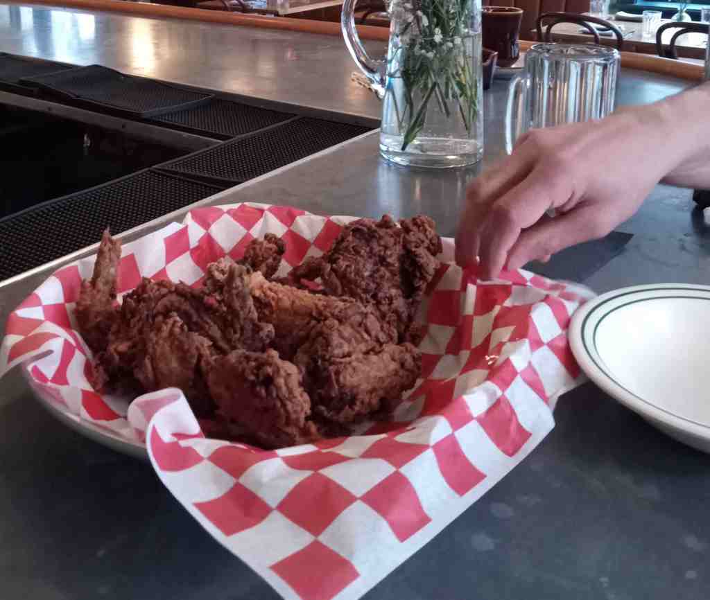 How many times do we have to tell you that the food is good at Mama Roux? At this particular Brunch, right at 3:30, the wonderful people at Mama’s brought a full plate of fabulous fried chicken over to feed the DJs. Man, that was good! (The Boog made a note in his mind to bring more chicken records next time!)