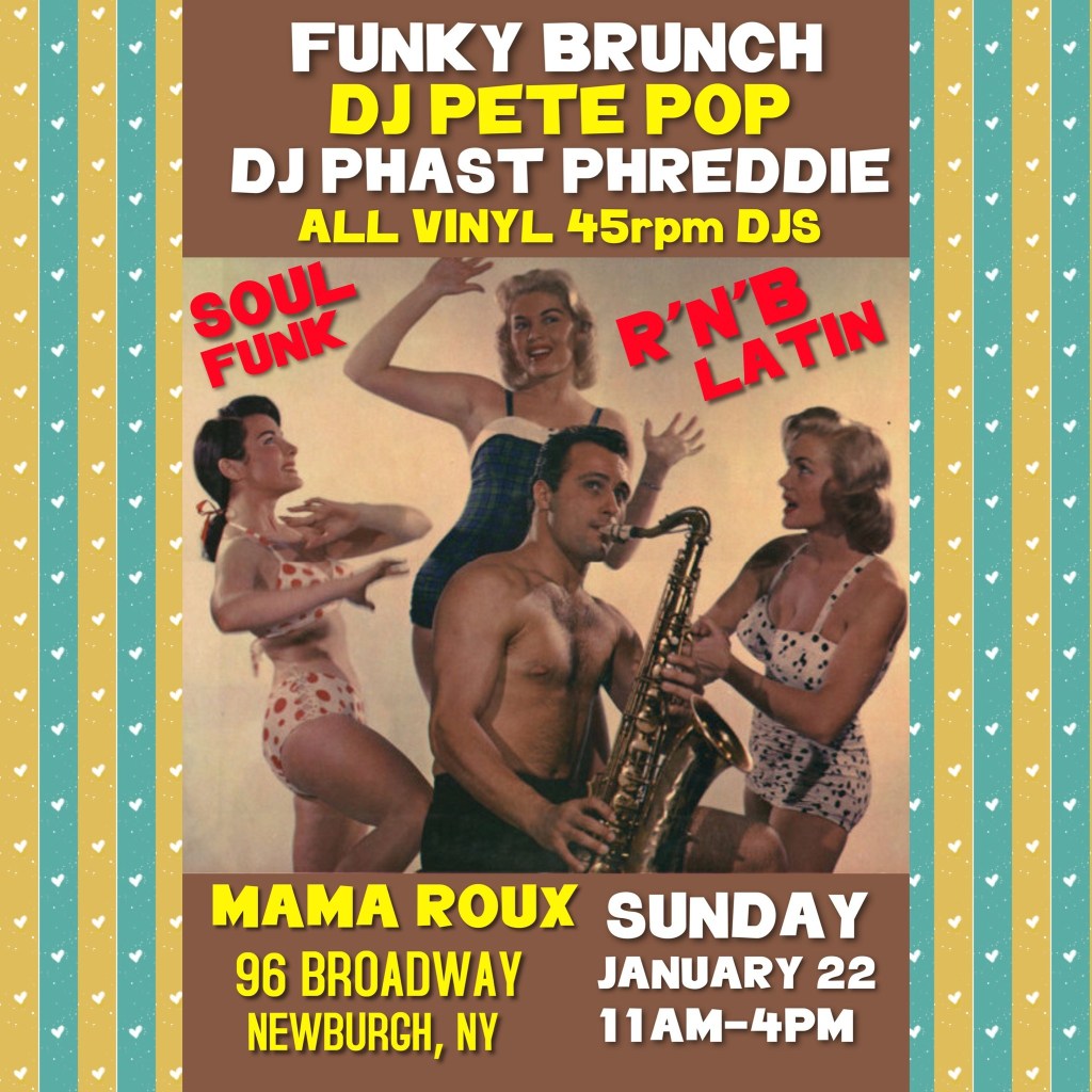 Sundays are Funky Brunch days. The day when DJ Pete Pop swings at Mama Roux with his groovy 45s. He rolls into the joint around 10am and sets up his equipment. By the time 11am comes around he has his turntables turning, mixing board mixing and speakers are speaking! On Sunday January 22, Mr. Pop invited Phast Phreddie the Boogaloo Omnibus to come spin a few records with him.