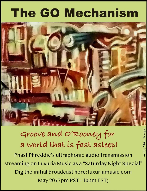 This is episode sixteen of The GO Mechanism—an audio odyssey designed to shatter your fragile egg-shell mind. It is hosted by Phast Phreddie who develops it in the secret laboratories of Boogaloo Omnibus Productions somewhere in the Hudson Valley. The “G” stands for Groovy and it certainly is. The “O” stands for O’Rooney, a complex impulse that is incomprehensible to those possessing standard-issue precepts. If you have to ask, you will never know.