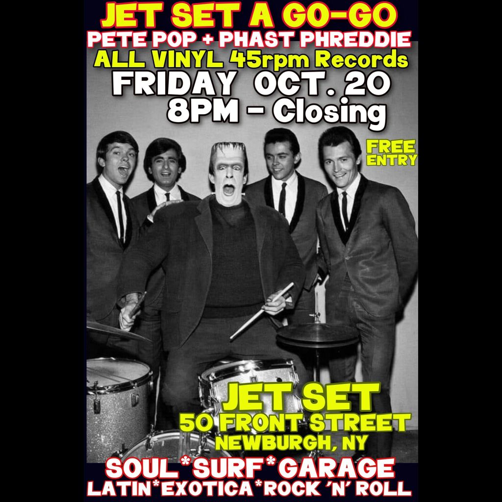 On Friday October 20, our pal DJ Pete Pop hosted another Jet Set A’ Go-Go at Newburgh’s fabulous new tiki lounge, The Jet Set. Phast Phreddie the Boogaloo Omnibus was invited to be guest DJ. Since it was October, and with that sacred day Halloween just around the corner, many monster records were worked into the usual Jet Set A’ Go-Go fare of surf music, mambos and other groovy stuff.