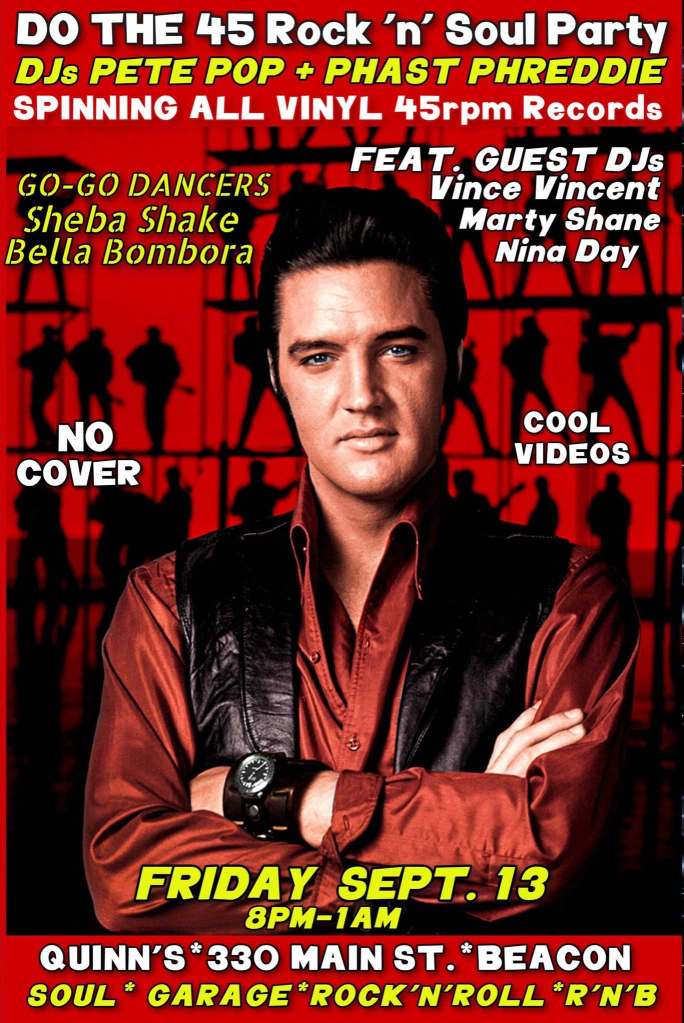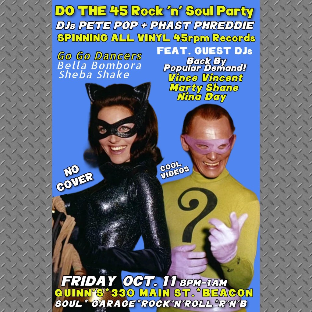 On October 11, another fantastic Do The 45 took place at Quinn’s in Beacon, NY. The September event was so successful, what with all the guest DJs, that host Pete Pop decided to invite them all back: Marty Shane, Nina Day and the inimitable Vince Vincent, along with eternal guest DJ Phast Phreddie the Boogaloo Omnibus. They all played top-notch groovy jams that kept the Quinn’s folk boppin’ all night.