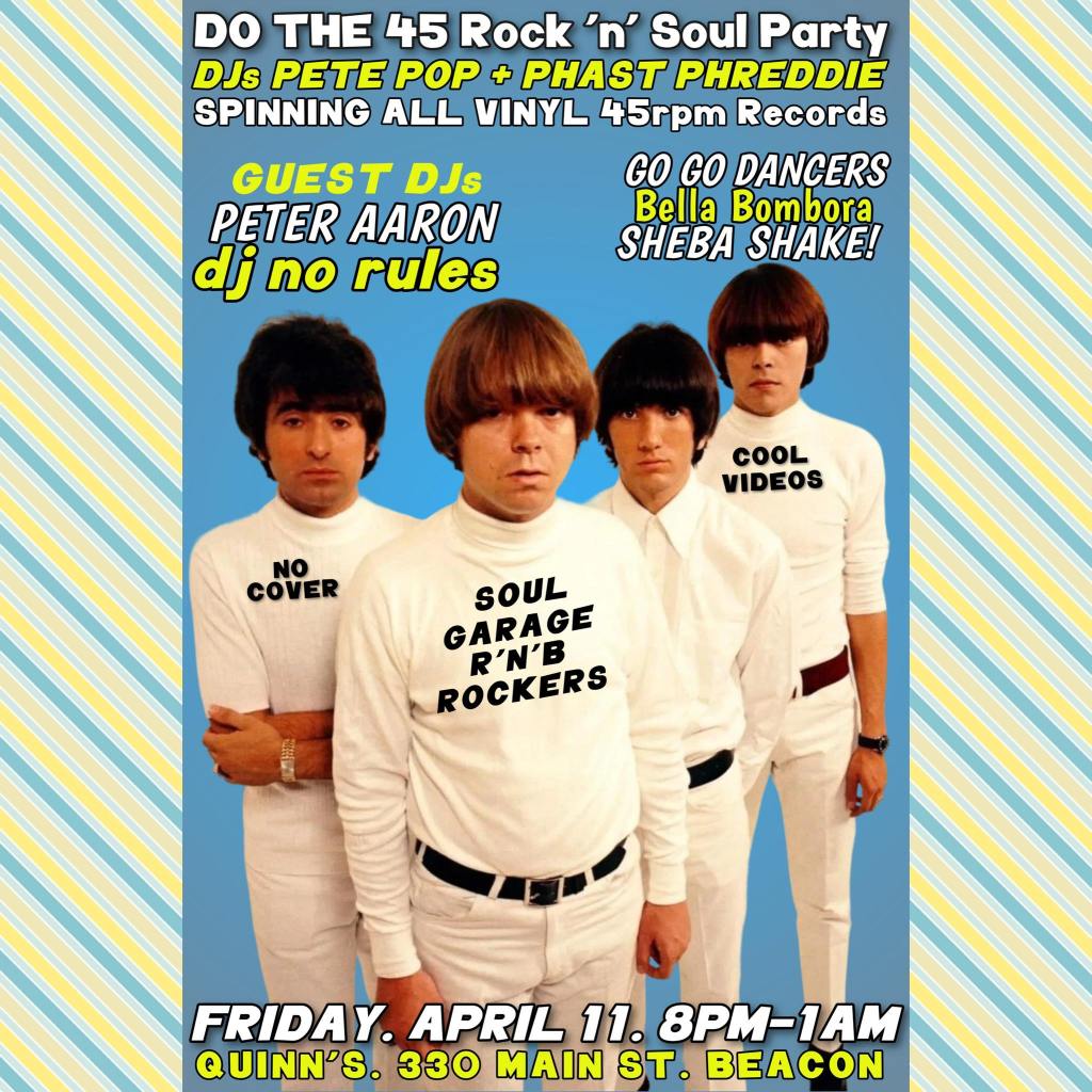 On April 11, host DJ Pete Pop introduced a new DJ to the Do The 45 world: DJ No Rules. He is a local Beacon cat who works pizza joints, breweries and skating rinks; the kind of DJ that wears a baseball cap and fools with the mixer’s effects. In spite of that, he played some great records: mostly cool organ grooves and funky jams that went well with the early time slot that Mr. Pop put him in. It was the perfect music for folks who were chowing down on the ramen noodle dinner that Quinn’s is famous for. Our pal Peter Aaron was also slated to appear, but he was apparently in poor health and couldn’t make the scene. We’ll have him back soon, don’t worry.
