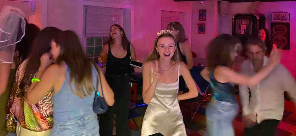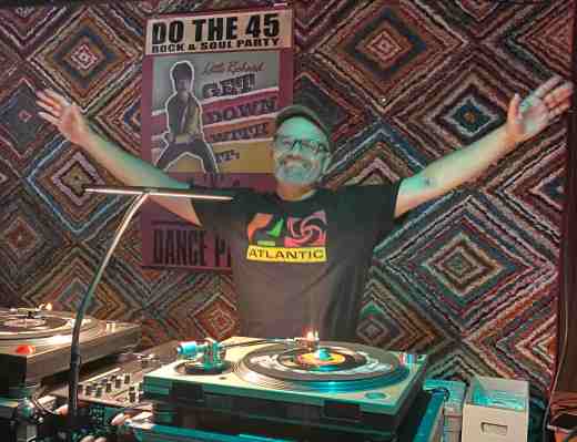 A few folks from the wedding party ventured into the Dog Room to dig the Shimmy action. Some of them danced around. One fellow requested some contemporary songs that were not pressed on 45 RPM records, the media used at the Shimmy. After being denied the satisfaction of hearing those songs, he asked Pete Pop, “What are you trying to accomplish here?”