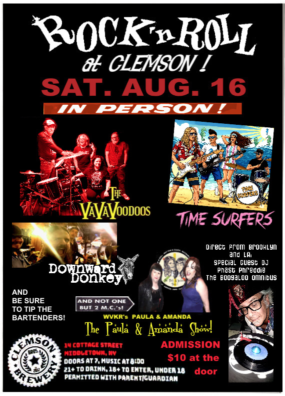 Paula Grace and Amanda Lay are the two hostesses of The Paula and Amanda Show, a very groovy program that airs on radio station WVKR at Vassar College in Poughkeepsie. The show is on every other Friday night at 7:00. The first time we heard the show we thought, these people are nuts—but they play fantastic records!! Every once in a while, they get a bug to promote their own Rock’n’Roll shows. They did so on August 16. The event was held at a joint in Middletown, NY called Clemson Brewery. The place had a nice sized show room with a big stage. Phast Phreddie the Boogaloo Omnibus was honored to act as the DJ for the night. He played records before, in between and a little bit after the bands played.