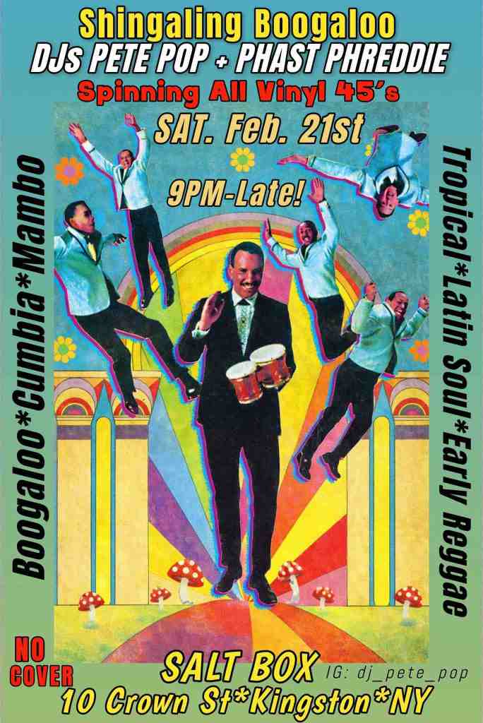 On February 21, DJ Pete Pop and his sidekick Phast Phreddie the Boogaloo Omnibus introduced a new concept in disco DJ nights: ¡Shingaling Boogaloo! At this event—which will take place on every other third Saturday of the month at the Salt Box (rotating with Funky Kingston)—the two DJs will play their bossest tropical-style records: mambo; latin soul, cumbia, boogaloo, reggae, Afro-groove and just about anything with bongos. This is a format that Pete Pop has been dreaming about for the last several years and it finally happened.