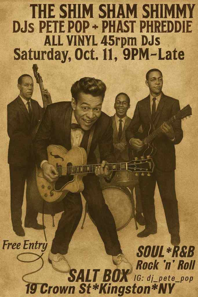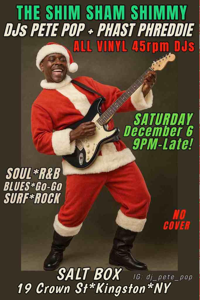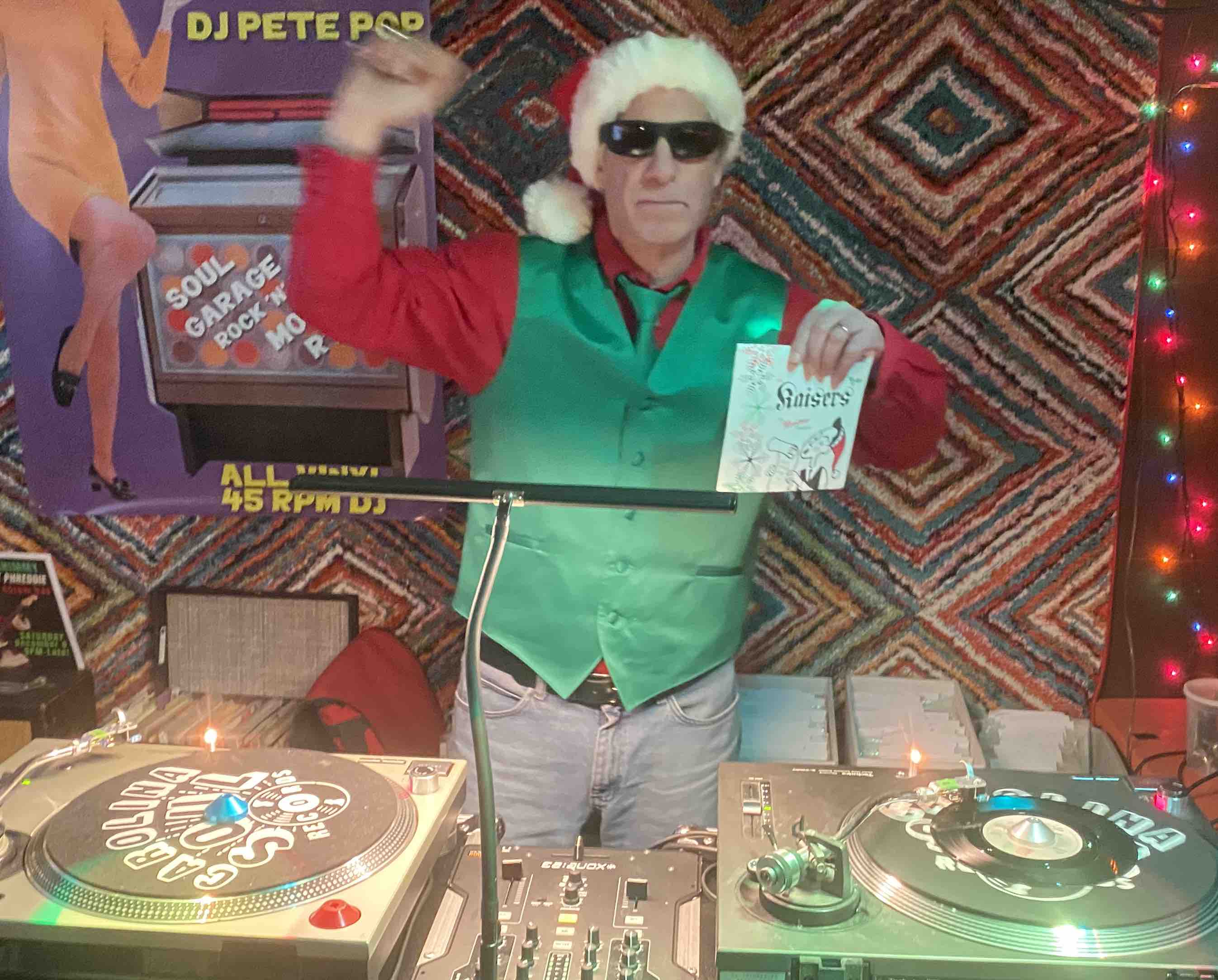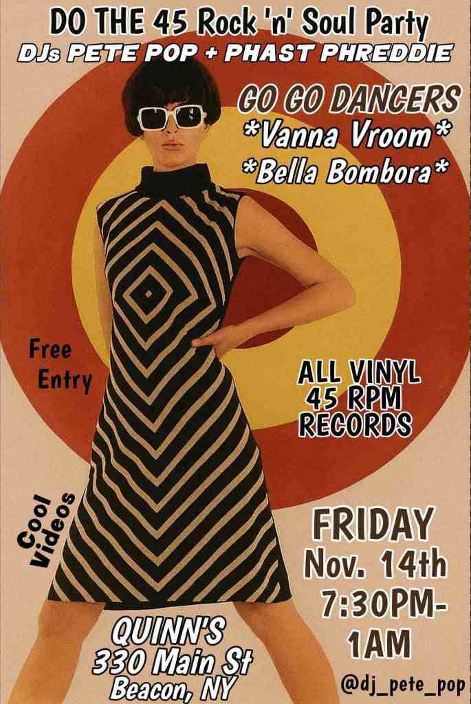 On December 12, Do The 45 took place as scheduled at Quinn’s—that groovy rock and ramen joint on Main Street in Beacon, NY. Because of its close proximity to Christmas, host DJs Pete Pop and Phast Phreddie the Boogaloo Omnibus invited radio personality Vince Vincent to come play a set of rockin’ holiday records. Man, that was a gas—he even showed up in an appropriate green/red outfit and shook jingle bells. That Mr. Vincent really knows how to entertain a crowd.