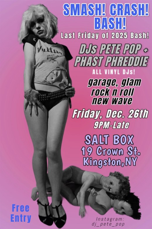 ••• SMASH! CRASH! BASH! — On the last Friday of each month, our pals Peter Aaron and Sean McDJ host this DJ night at the Salt Box where they play all sorts of rockin’ records; mostly punk and new wave. Neither can make the scene in December, so Pete Pop and Phast Phreddie the Boogaloo Omnibus will swing instead. This is a very special night where records from the seventies, eighties and beyond get played—maybe even some LP cuts! Don’t you dare miss it! It all happens at the Salt Box in Kingston, NY on December 26 from 9pm until they kick us out!!