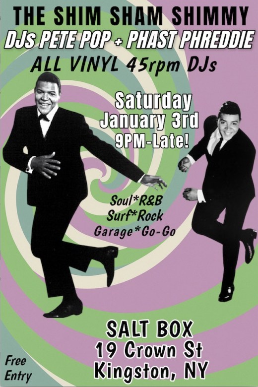 ••• First Saturday of the month: The SHIM SHAM SHIMMY… an evening of reet music. Dig wild trash from the fifties and sixties—rock’n’roll, rockabilly, R&B, soul, blues, jump blues, ska, mambo, maybe even garage rock. It all happens with host DJ Pete Pop at the Salt Box in Kingston, NY. We swing from 9pm until they kick us out!