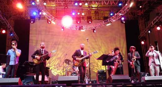 The featured performer at Midsummer Night Swing was Binky Griptite and his incredible jumping orchestra. Mr. Griptite, as the astute Boogaloo Bag reader knows, was the guitarist for The Dap Kings, the funky band behind the late, great Sharon Jones. After Ms. Jones‘ sad passing last November, Mr. Griptite proceeded to reinvent himself as a modern day T-Bone Walker–singing and playing guitar in front of a swingin’ and rockin’ little big band…and he does it really well. The Boogaloo Bag writers witnessed a performance at a high school gymnasium about a month earlier and dug the scene. At his Midsummer Night Swing gig, his band was augmented with a couple more horns, a female singer and our pal Eli “Paperboy” Reed on harmonica. The Boog was on hand in order to provide the spinning of jump blues 45s between sets.