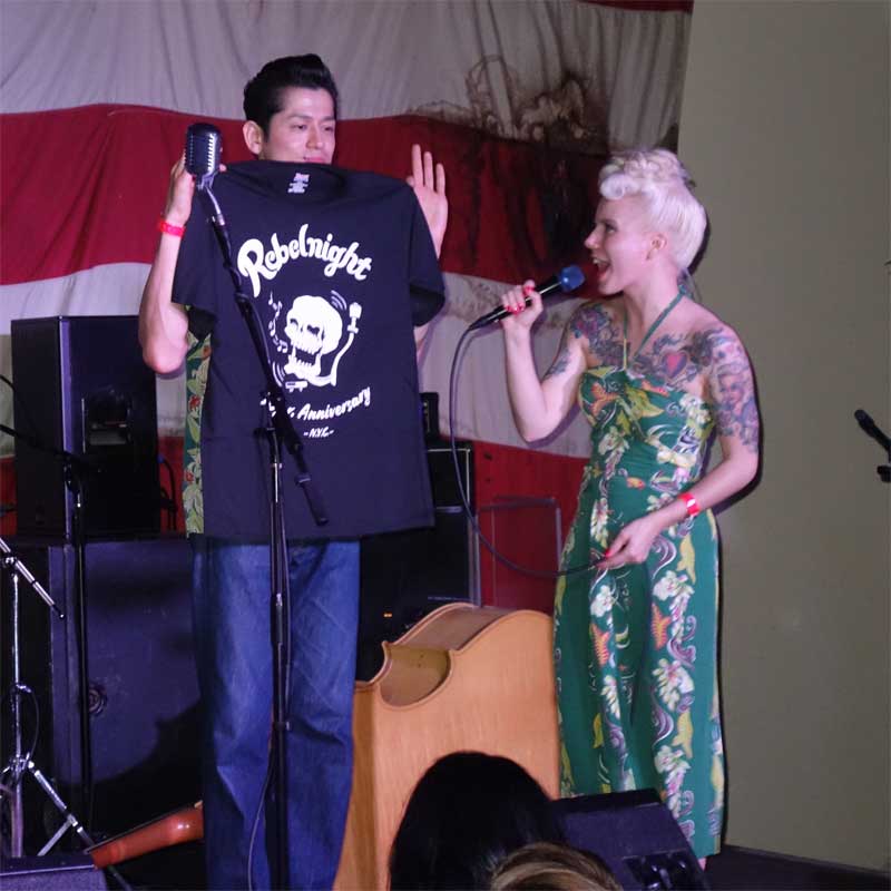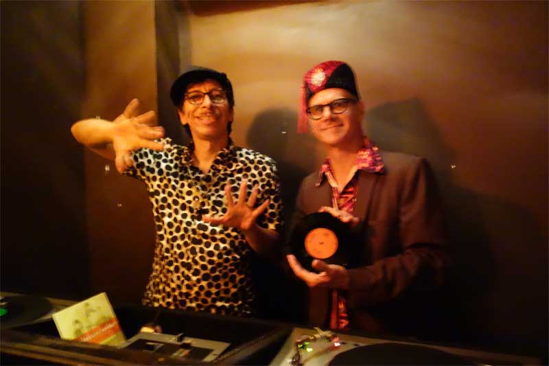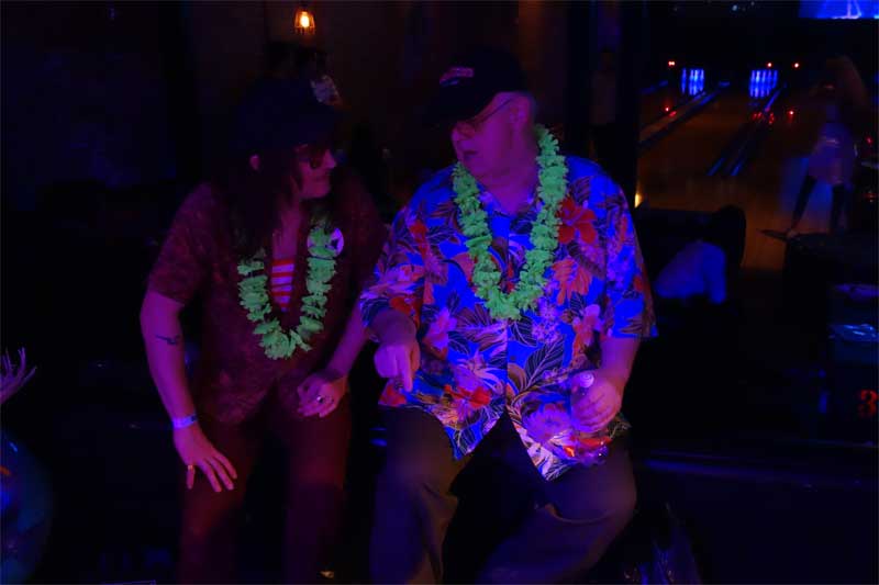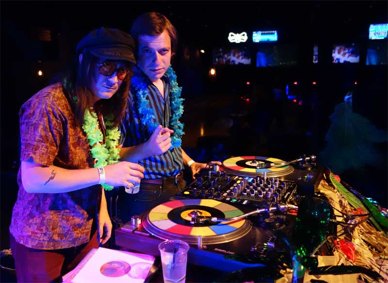 After the performance, our pal Josh Styles headed up a team of DJs who presented the official after-show party called Surf City. Mr. Styles, Avi Spivak (Human Being Lawnmower) and Phast Phreddie the Boogaloo Omnibus each took turns playing appropriate records: mostly guitar-driven instrumentals and songs about fun in the sun. Around one o’clock in the morning or so, a limbo dance contest was held and The Boog was happy to supply the soundtrack for that with a stack of calypso and jungle-beat 45s. As last year, the host of the limbo contest was cult horror film director Frank Henenlotter (Basket Case, Brain Damage). Once the winner was chosen, The Boog instantly switched gears to lead off the dance party portion of the evening by playing The Beach Boys’ bossest record, “Dance Dance Dance.” In the middle of his first set, The Boog spun a bowling record (complete with bowling sounds!), that got the Brooklyn Bowl staff very excited!