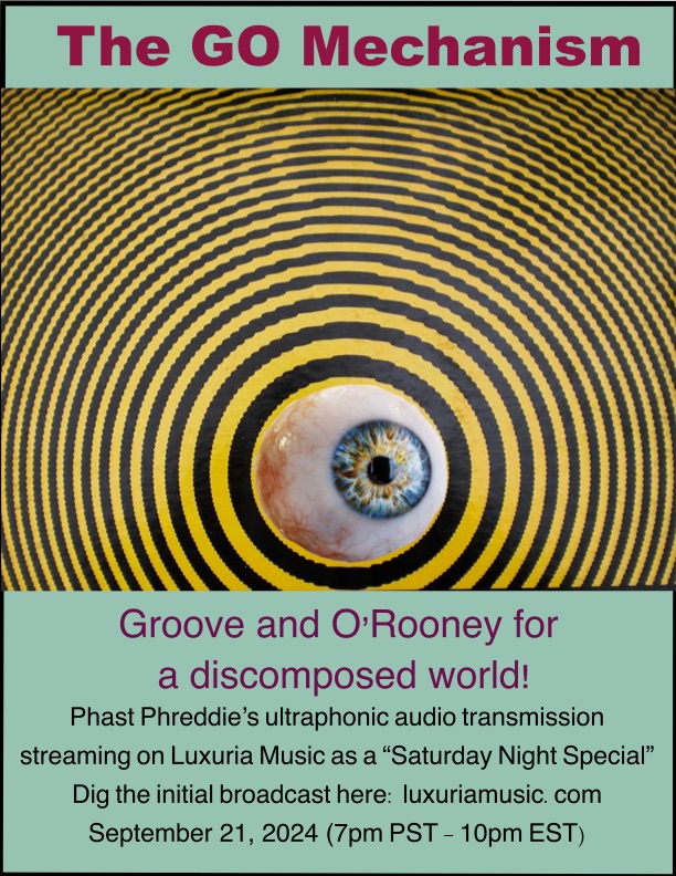 This is is the program notes for the corresponding GO Mechanism Number Twenty Six as it premiers on the Luxuria Music web-O-net as a Saturday Night Special on January 18 (or, as a podcast the next day). The GO Mechanism is an audio Odyssey that is hosted by Phast Phreddie. It is scientifically engineered and programed in the secret laboratory of Boogaloo Omnibus Productions incorporating ultra-phonic techniques not available to other broadcast entities. The G stands for GROOVE, and there will be plenty of GROOVE in each GO Mechanism. The O stands for O’ROONY, an intricate and complex attitude that is incomprehensible to those who possess standard-issue precepts. Listen and you will hear.