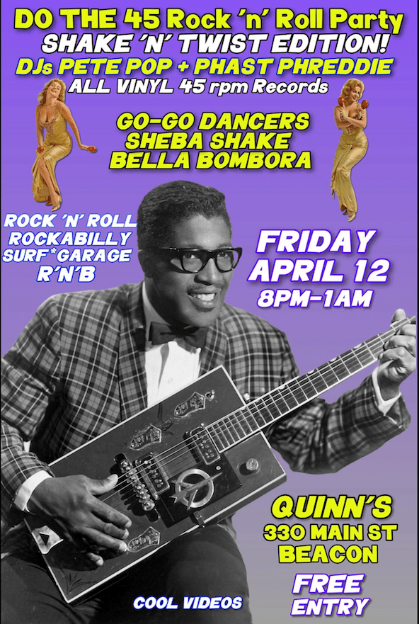 On January 4, The Shim Sham Shimmy rolled into the Salt Box in Kingston, NY. Folks, this is the fun one, the one that rocks, the one that swings, the one that bops the one that everyone is talking about. At the Shim, DJs Pete Pop and Phast Phreddie the Boogaloo Omnibus spin fantastic 45s: R&B, Blues, Soul, Surf, Rock’n’Roll, Rockabilly, Jump Blues and all kinds of nasty, jumpin’, rockin’ and swingin’ trash. On this particular night, things got so hectic that we forgot to take but one photo! You know it was a grand affair when drinks got spilled and glasses got broken!